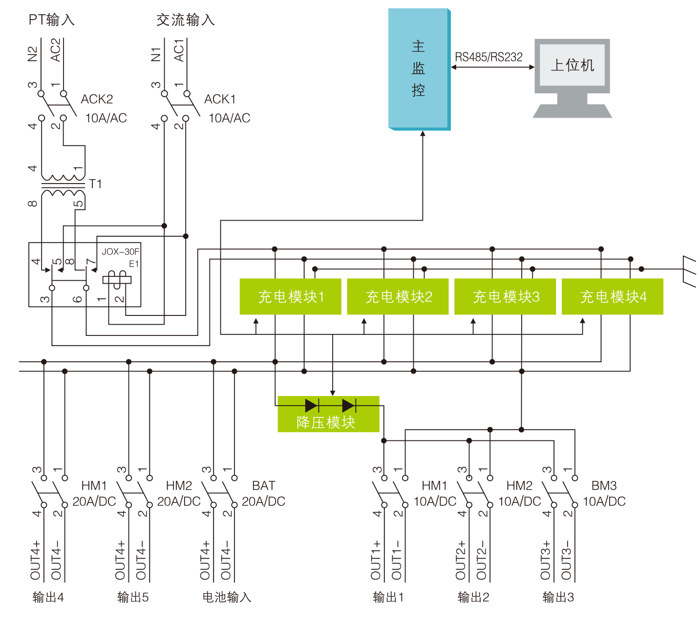 兩路市電經(jīng)過自動(dòng)切換輸入一路交流,給整流模塊供電。整流模塊將輸入的交流AC轉(zhuǎn)換為直流DC,給蓄電池充電,同時(shí)給合用母線(合母)負(fù)載供電;另外合閘母線通過降壓模塊后給控制母線(控母)負(fù)載供電。系統(tǒng)中運(yùn)行的各種功能模塊受主監(jiān)控和后臺(tái)監(jiān)控及遠(yuǎn)程監(jiān)控的控制,監(jiān)控可實(shí)時(shí)顯示運(yùn)行信息、查詢信息及操控系統(tǒng)。