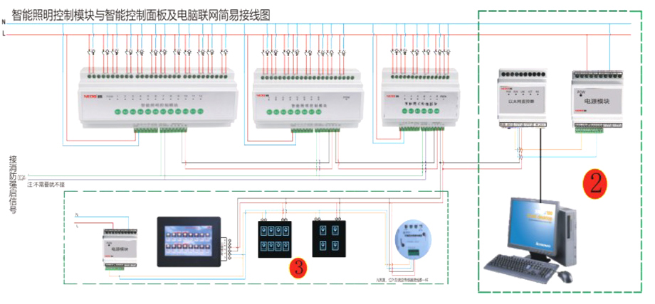 4.照明控制模塊與電腦聯(lián)網(wǎng)控制,不接其他控制面板連接時,3號虛線內(nèi)不需連接,