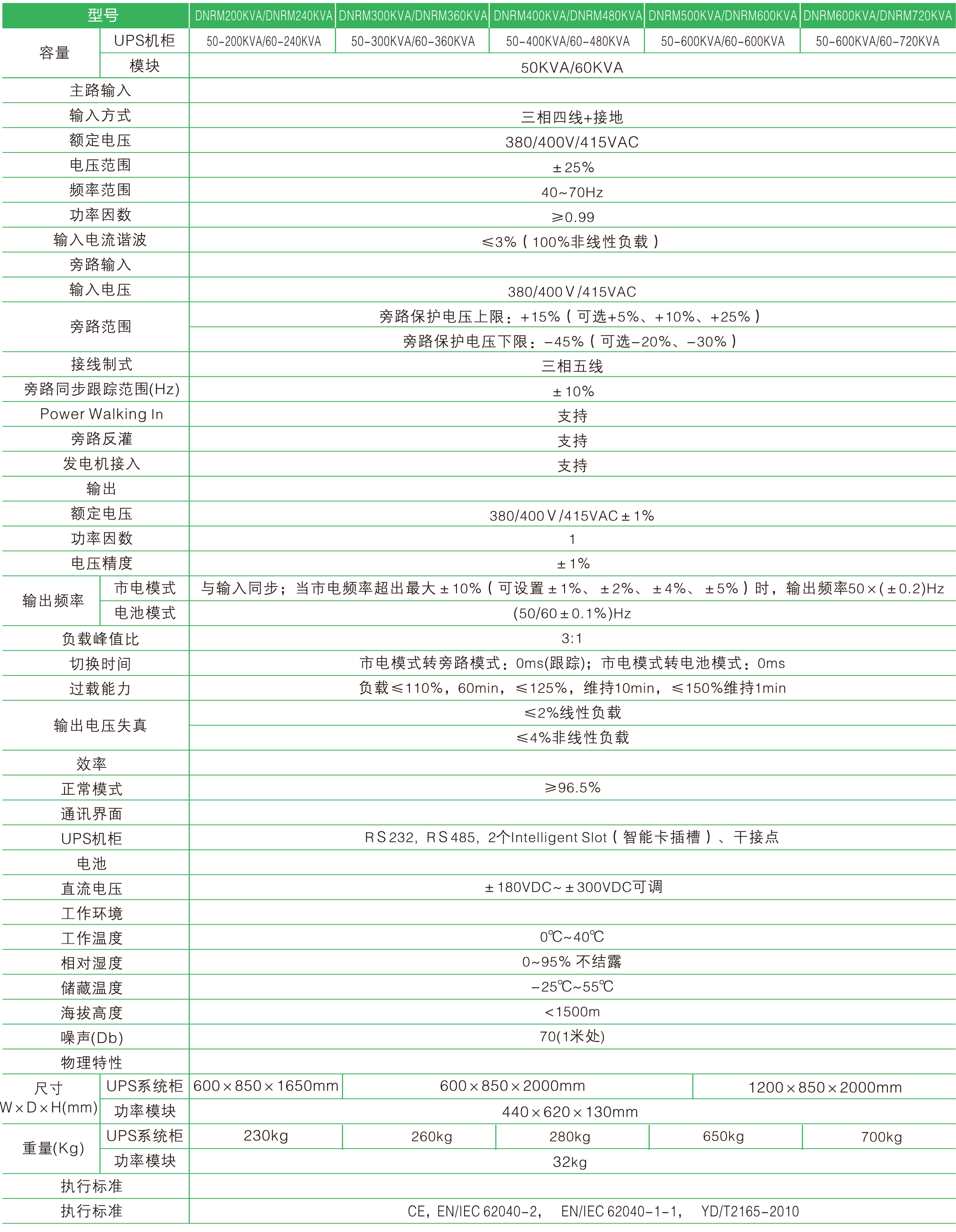 迪能DNRM系列為三進三出UPS,產(chǎn)品采用模塊化設(shè)計與N+X并聯(lián)冗余技術(shù),產(chǎn)品容量覆蓋50KVA/60KVA到600KVA/720KVA之間的各個功率段,方便用戶靈活配置與逐步投資。該系列UPS幾乎可以完全解決所有的電源問題,如斷電、市電高壓、市電低壓、電壓瞬間跌落、減幅振蕩、高壓脈沖、電壓波動、浪涌電壓、諧波失真、雜波干擾、頻率波動等電源問題。